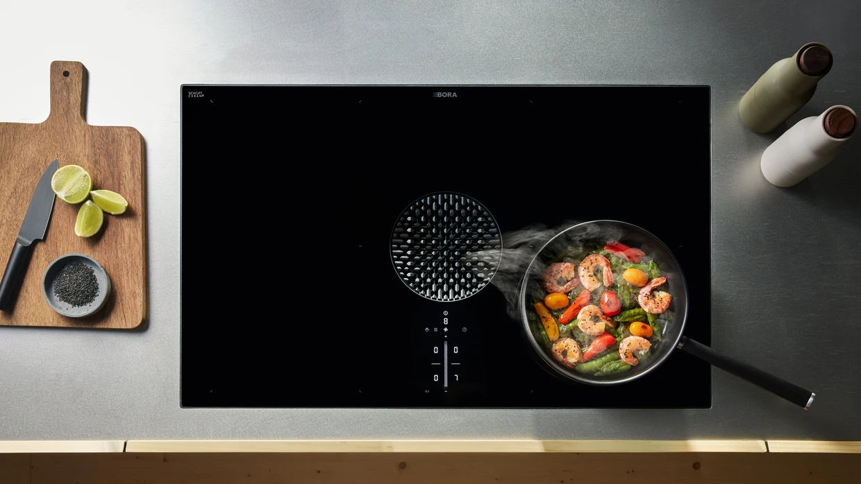 The end of the extractor hood – cooking with a clear view while surrounded by fresh air. Cooktop and extractor combined in a single appliance. Cooktop extractor systems by BORA.